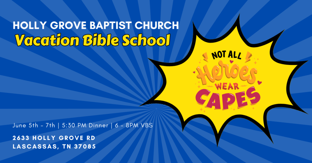 Join us for food, fun and fellowship on June 5th, 6th, and 7th at Holly Grove Baptist Church’s annual Vacation Bible School! Dinner will be served at 5:30 PM each night, and VBS activities will be from 6PM through 8PM.